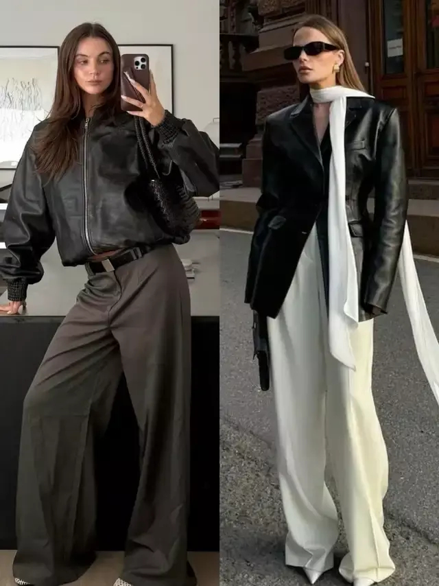 穿皮衣外衣贵在检朴,形态干净,线条利落,整个东谈主才会澄澈干练。下半身的裤装相似如斯,配上西装裤,精致通勤,气质在意。