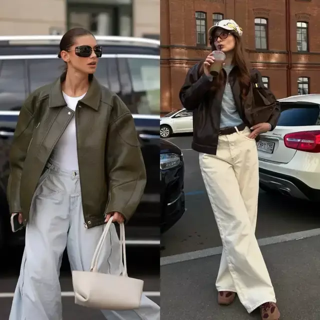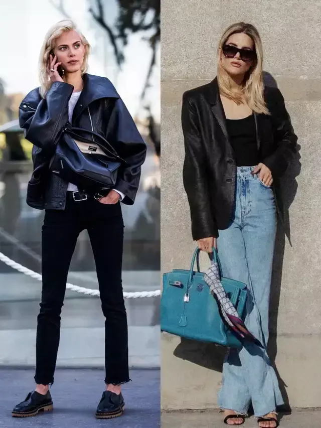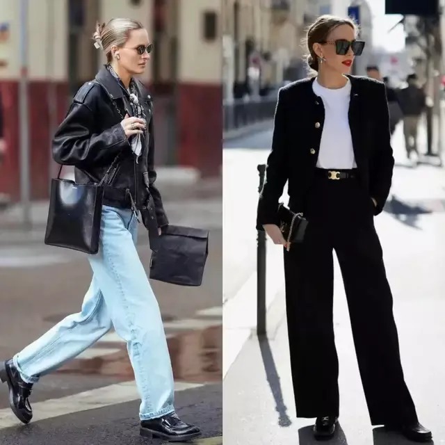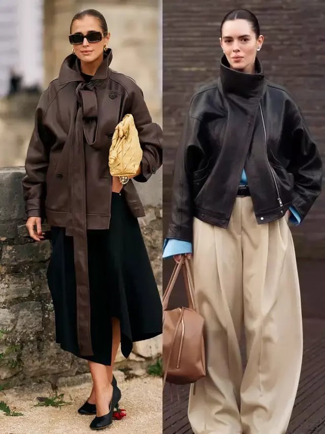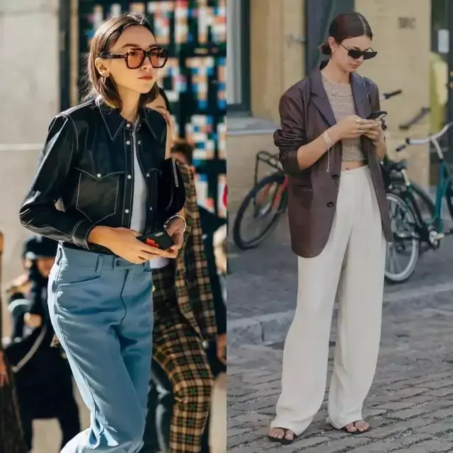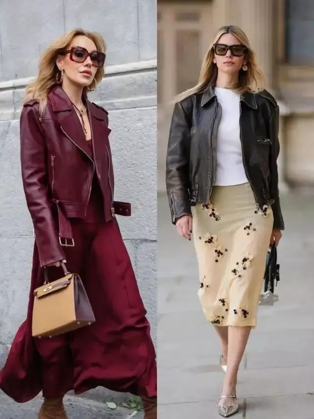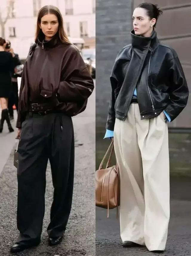 皮衣与裤装的搭配从来都是顺着自体格态而来,形体高挑就选紧身裤,勾画出任性酷感,若胯宽腿粗,选直筒裤、阔腿裤就能遮住形体弱势。