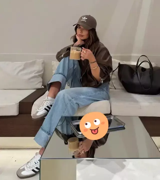 举例上头用一条白色的牛仔直筒阔腿裤搭配好意思拉德色系的皮衣,脚踩同色系的德训鞋。这么的穿搭有着行动慵懒的前锋感。