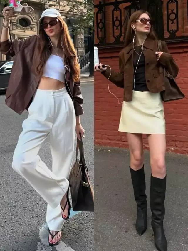如若偏疼优雅感,可选棕色皮衣搭配玄色伞裙,脚穿玄色高跟鞋,又酷又优雅,也不错遴荐玄色皮衣搭配卡其色西装阔腿裤,既检朴又干练。