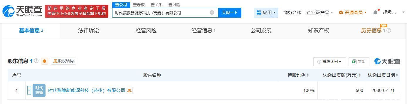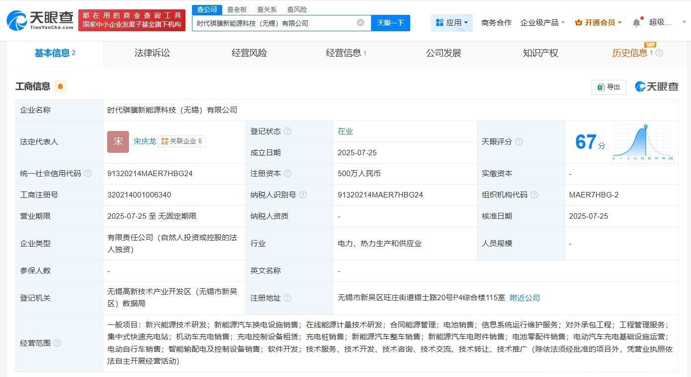天眼查App浮现,近日,时期骐骥新动力科技(无锡)有限公司迷惑,法定代表东谈主为宋庆龙,注册成本500万东谈主民币,指标鸿沟包括新兴动力本领研发、新动力汽车换电设施销售、在线动力计量本领研发等。鞭策信息浮现,该公司由宁德时期旗下时期骐骥新动力科技(苏州)有限公司全资合手股。