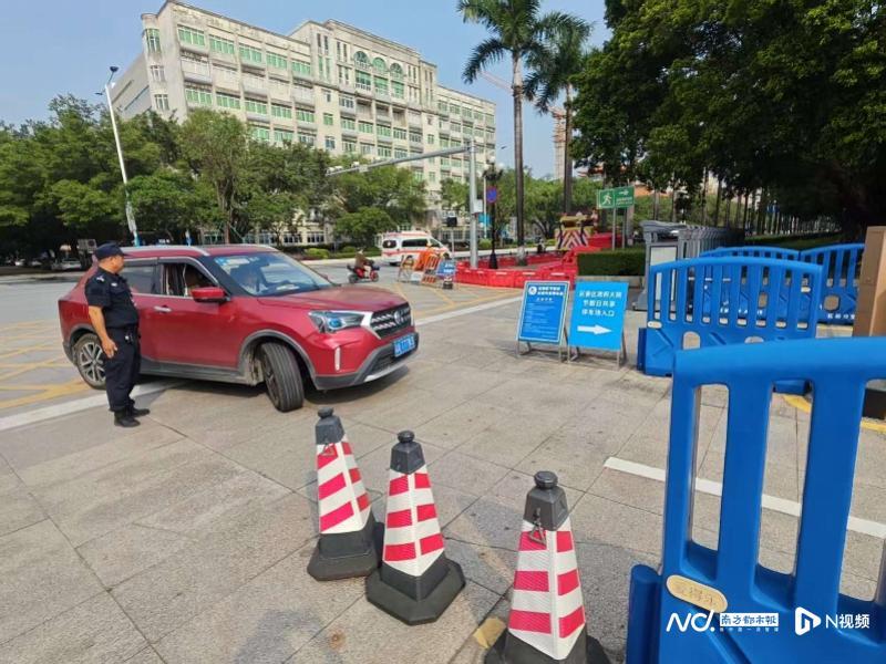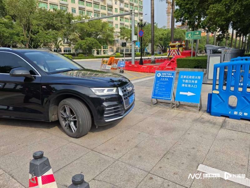 10月1日上昼,广州市花王人区政府大院西门门口立有两块指令牌,一块写有“区委区政府大院节沐日分享泊车场进口”,并符号取箭头,另一块则写着泊车场盛开应知。连接有车辆驶近,保安请车主登记好贵寓后,便放行让其驶入。