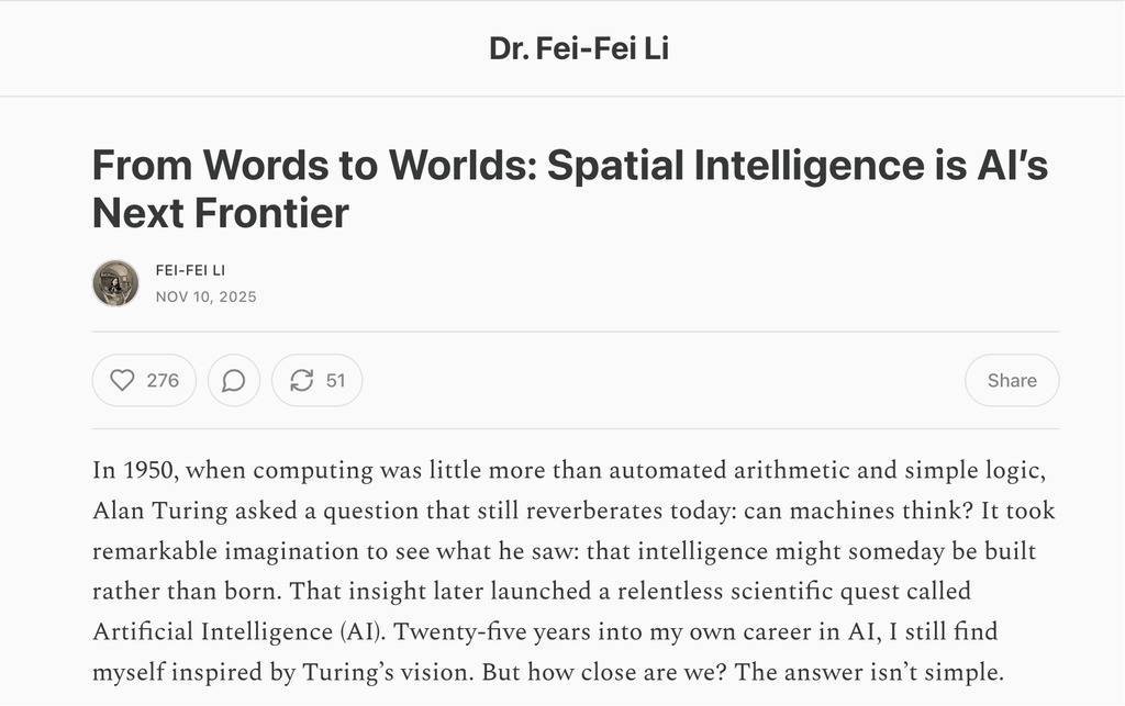 玄学家维特根斯坦曾说:“我的语言的界限意味着我的天下的界限。”我不是玄学家,但我深知,对于AI来说,天下远不啻是翰墨。空间智能代表着超越语言的前沿,它持续了想象力、感知力和行能源,为机器着实赋能东谈主类生活开辟了可能性,从医疗到创造力,从科学发现到平淡助理。